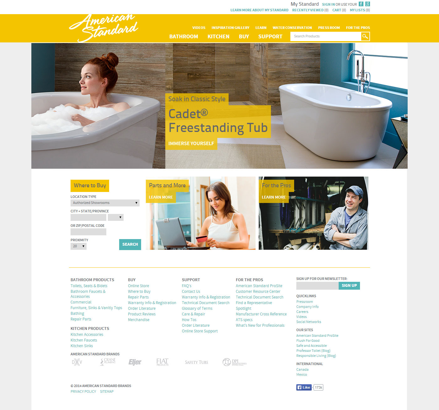 Ongoing relationship with American Standard resulted in multiple projects for all brands throughout North America. Key features of sites included: cross-site custom CMS; integrated profile management across brands/sites; multi-language localization support; custom e-commerce integration into SAP with multiple product types, shipping locations, role-based access control asset ordering, and multiple payment methods. Winner of multiple Silver American Advertising Awards in 2014.